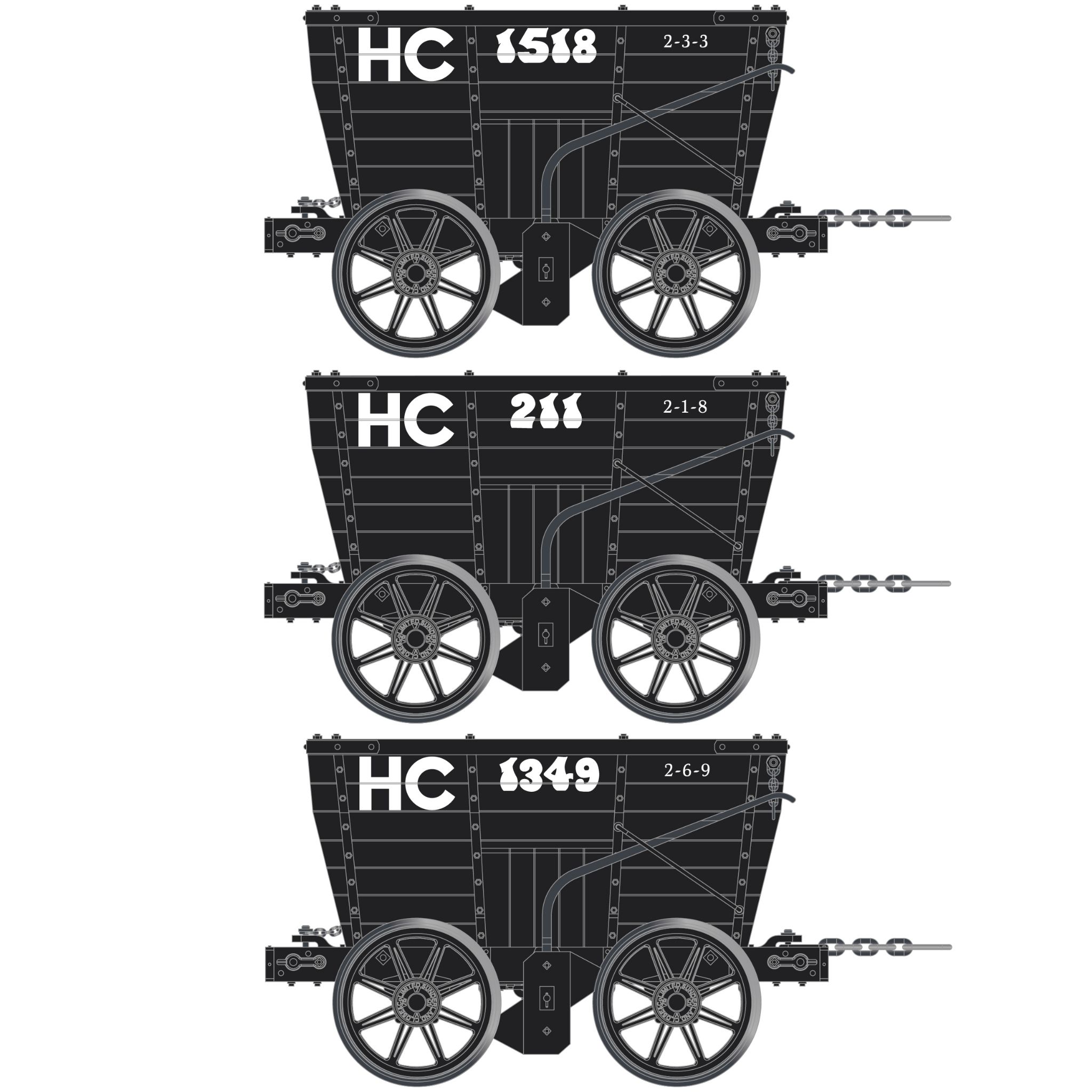 This pack contains 3 chaldron coal carrying wagons, all differently numbered
